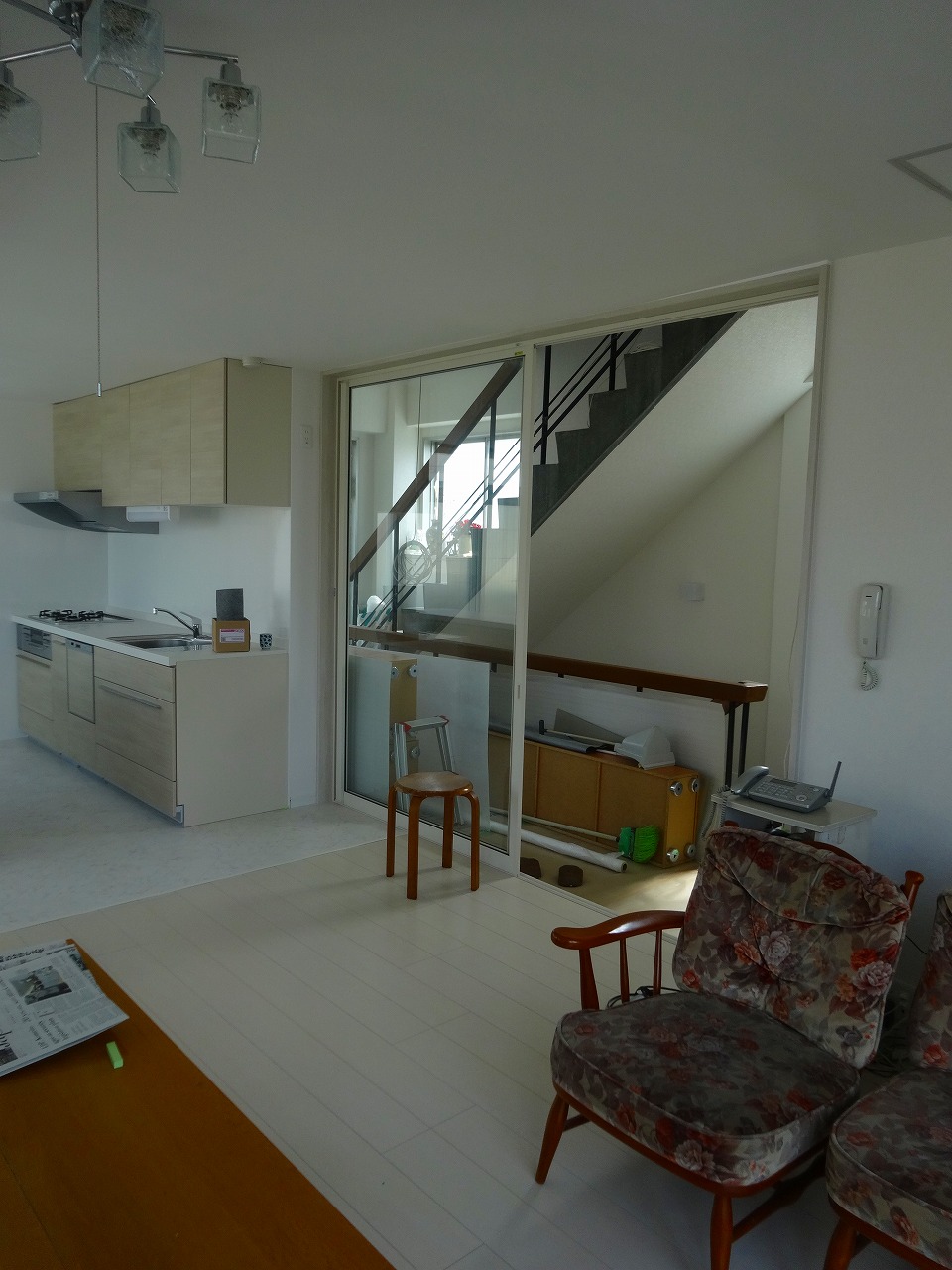現状のDKとキッチン、廊下をつなげて、LDKになりました。隣接した和室は大開口の引戸に替え、個室としてもLDKの1角にもできるようにしました。