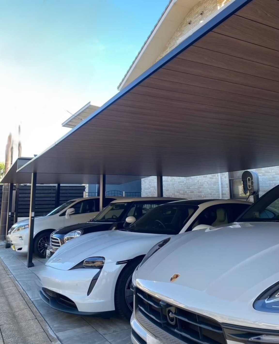 間口14mのカーポートの商品が無く、また前面道路に高低差があるため、この条件の基に、住宅のデザインと調和できるカーポートの組合せ方がポイントとなっています。後方支持カーポートの設置向きをを横向きにすることで、敷地を最大限に生かしながら、極力柱をなくしスタイリッシュなガレージになっています。アルミ屋根のカーポートはSCはシンプルな美しさを極めたデザインになっています。
